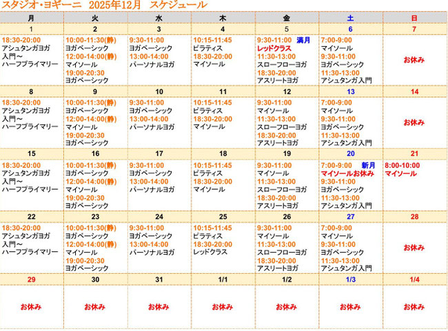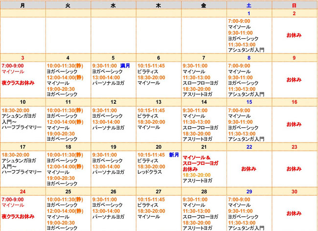 ※木曜日がムーンデーにあたる日は、マイソールクラスはお休みになります。